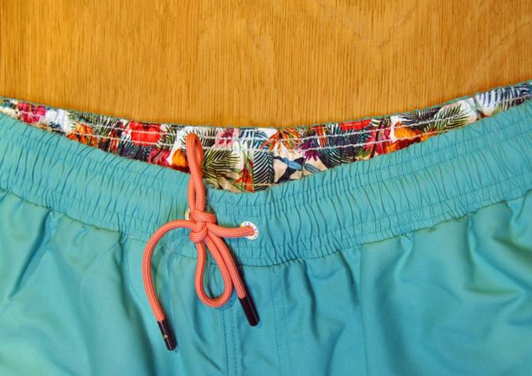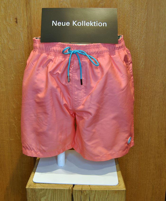 Badehose mit komfortabler Passform und Kordel in Kontrastfarbe (auch türkis). Die Hintertasche ist mit dem Print der Saison bedruckt.